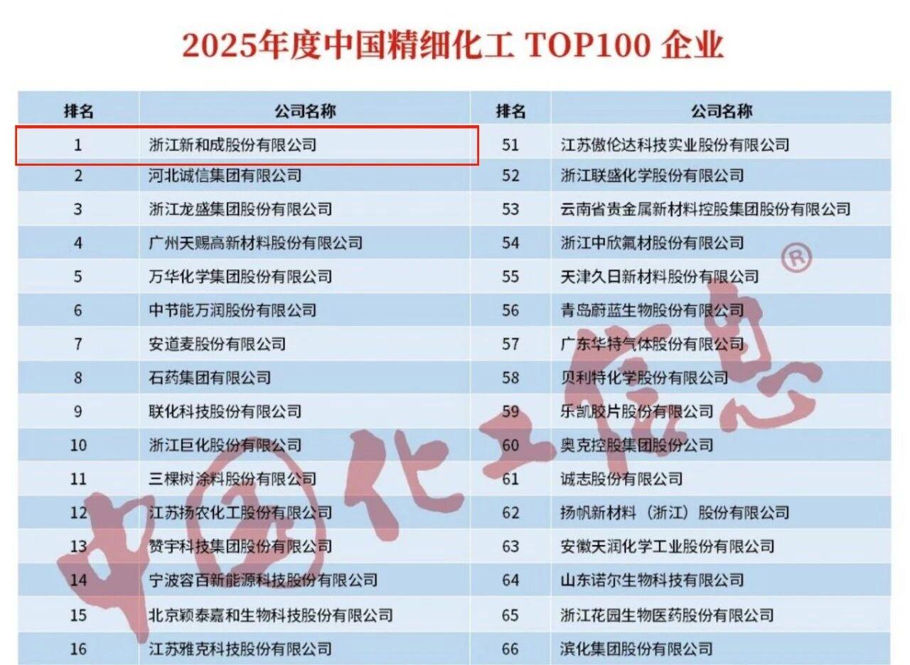 新和成同時(shí)榮膺“2025年度中國(guó)精細(xì)化工TOP100企業(yè)”“2025年度中國(guó)精細(xì)化工創(chuàng)新發(fā)展TOP10企業(yè)”榜首。此次登頂,既是對(duì)新和成綜合實(shí)力的高度認(rèn)可,也彰顯了新和成在經(jīng)營(yíng)管理、創(chuàng)新和綠色發(fā)展等方面的硬核實(shí)力。